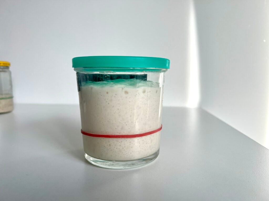 At this stage bubbles are typically visible throughout the entire height of the starter, showing that fermentation has fully expanded the structure.